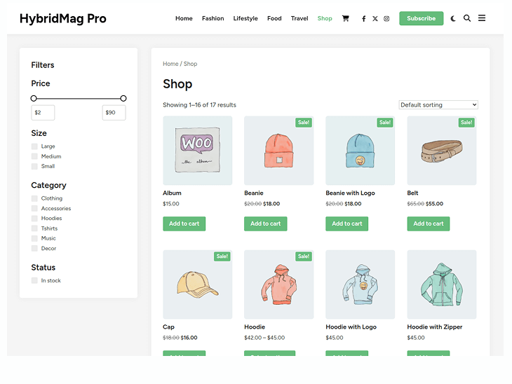 HybridMag works with WooCommerce out of the box. Upgrade to Pro for better shop layout control and conversion-focused features.